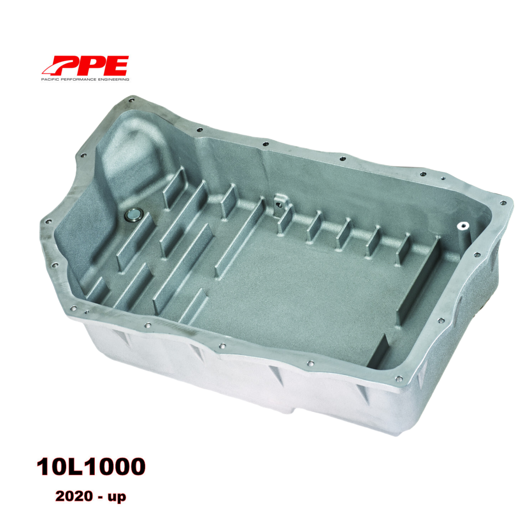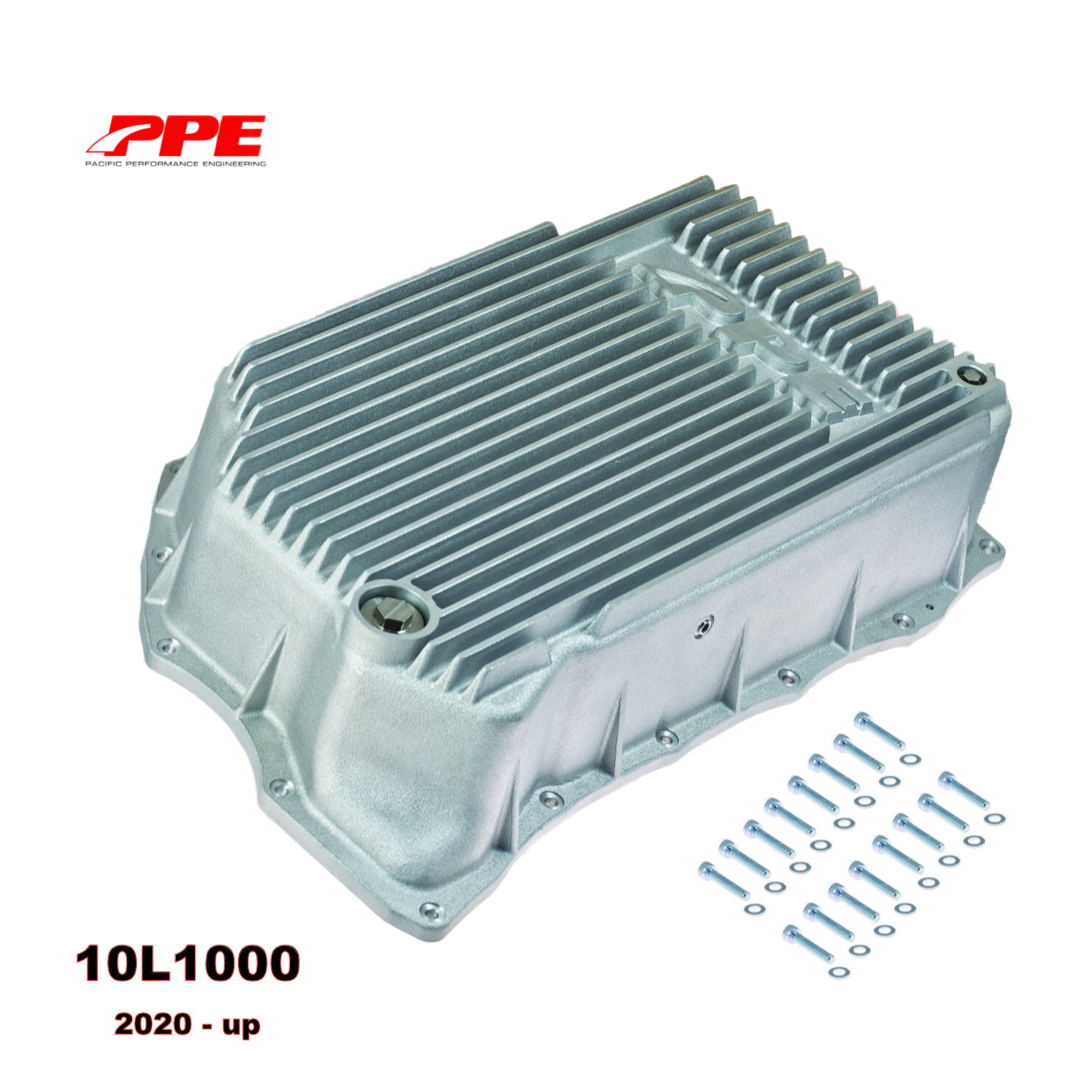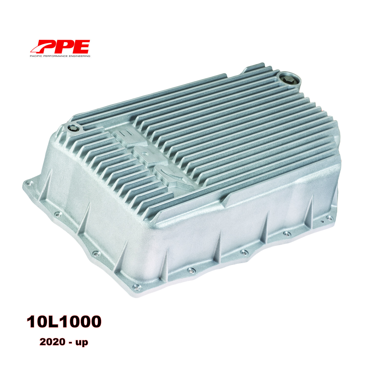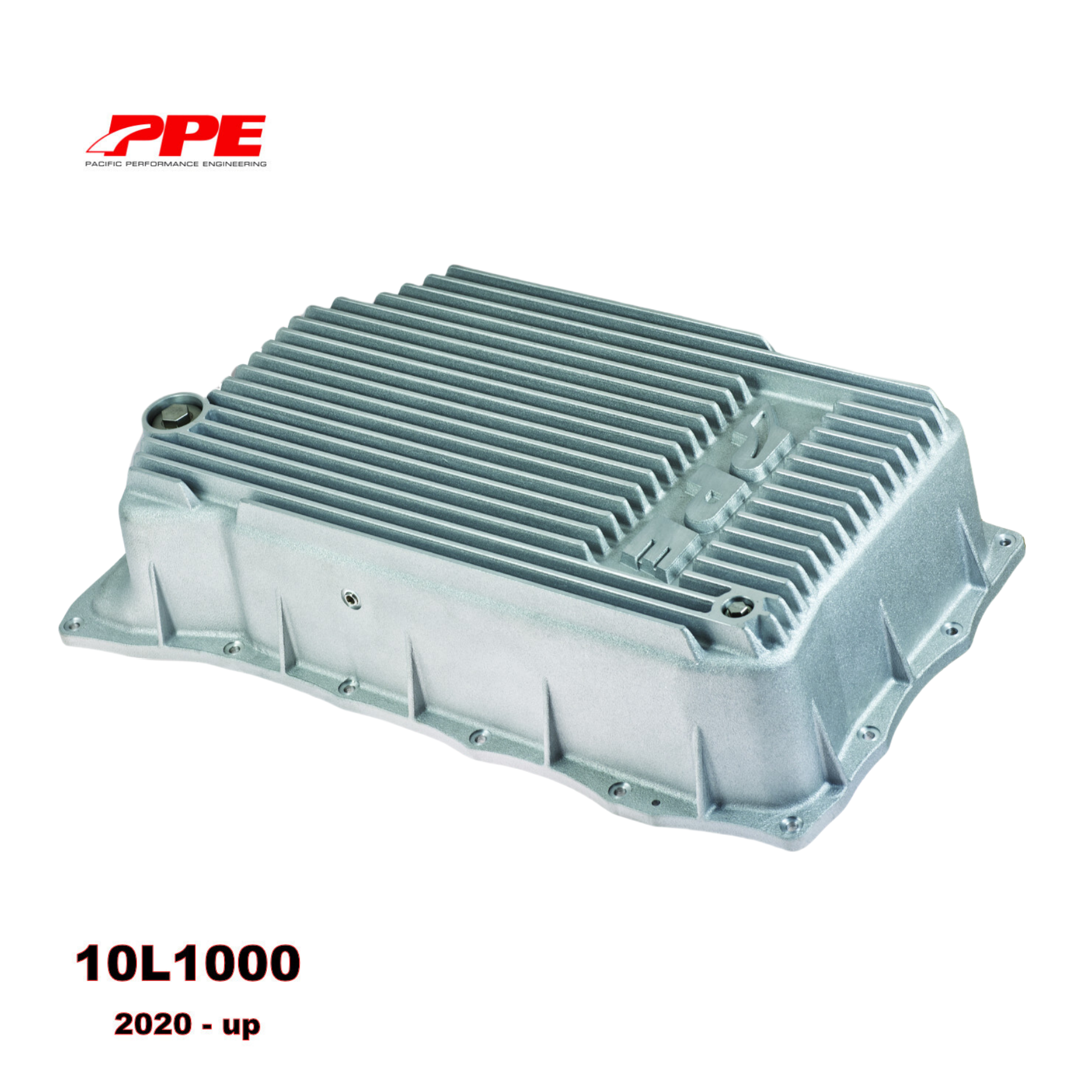 Get the best protection and performance out of your 10L1000 by upgrading to the PPE Heavy-Duty Cast Aluminum Deep Transmission Pan. The deep PPE Pan increases fluid capacity by a full gallon, which lowers transmission fluid temperature and increases thermal stamina. The engineered design includes cast aluminum fins and heat sinks to improve heat dissipation. External gussets provide extra support to the machined flange to increase overall robustness.