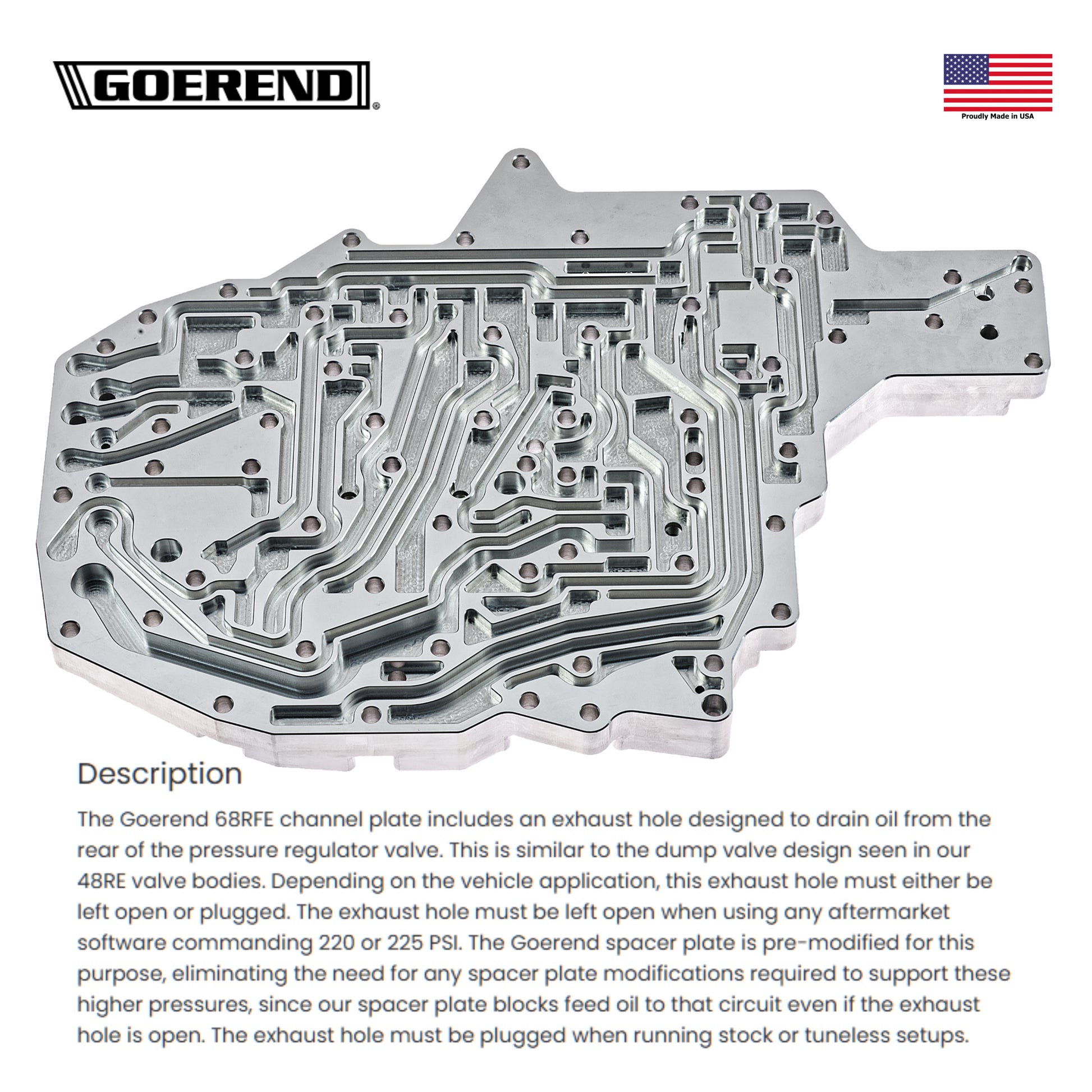 The Goerend 68RFE channel plate includes an exhaust hole designed to drain oil from the rear of the pressure regulator valve. This is similar to the dump valve design seen in our 48RE valve bodies. Depending on the vehicle application, this exhaust hole must either be left open or plugged. The exhaust hole must be left open when using any aftermarket software commanding 220 or 225 PSI. The Goerend spacer plate is pre-modified for this purpose, eliminating the need for any spacer plate modifications required to support these higher pressures, since our spacer plate blocks feed oil to that circuit even if the exhaust hole is open. The exhaust hole must be plugged when running stock or tuneless setups.