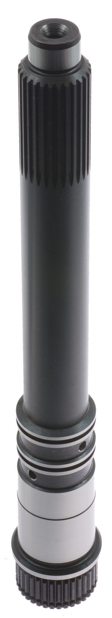 The 68RFE billet input shaft is custom forged from high-strength 300 maraging steel and is precision machined, ground, heat treated, and finished in black oxide. Lube feed holes are chamfered to improve flow and distribution.