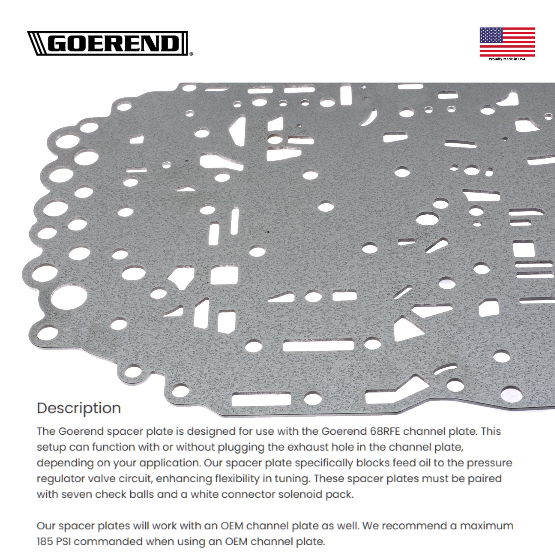 The Goerend spacer plate is designed for use with the Goerend 68RFE channel plate. This setup can function with or without plugging the exhaust hole in the channel plate, depending on your application. Our spacer plate specifically blocks feed oil to the pressure regulator valve circuit, enhancing flexibility in tuning. These spacer plates must be paired with seven check balls and a white connector solenoid pack.