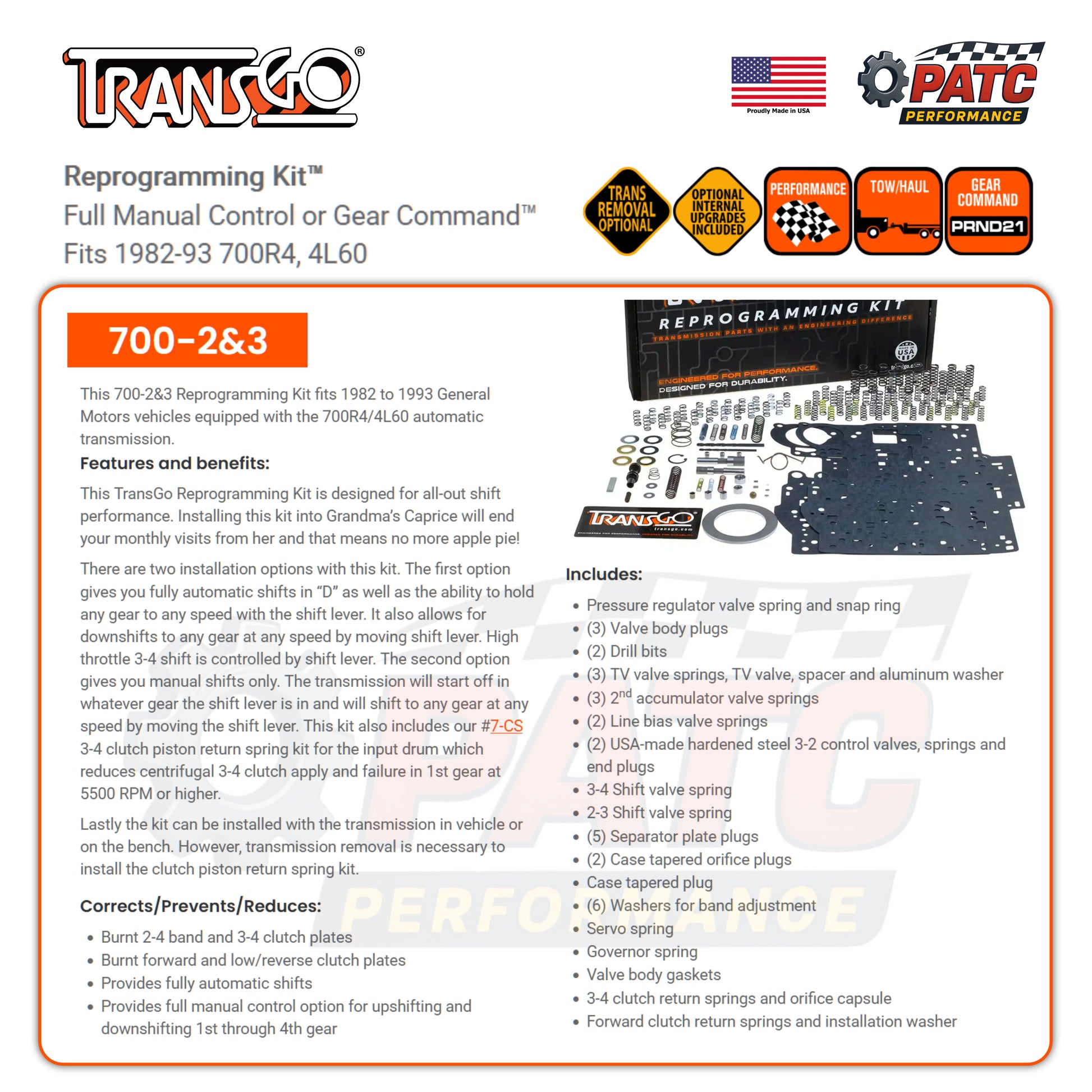 700R4 4L60 Performance Valve Body Reprogramming Kit TransGo 700-2&3