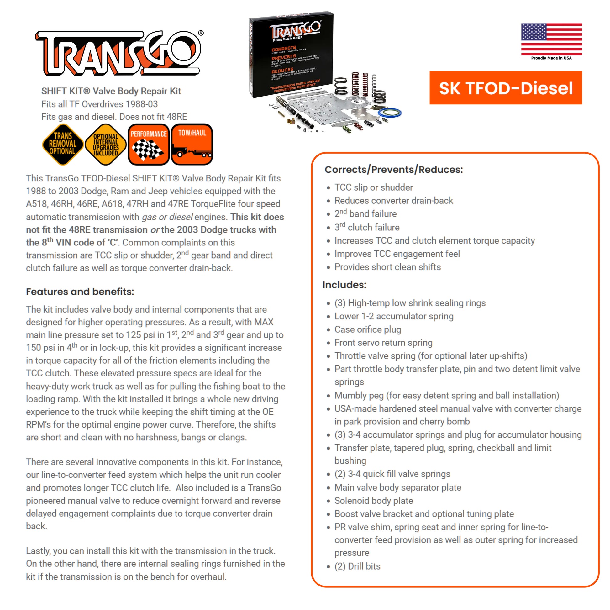 This TransGo TFOD-Diesel SHIFT KIT® Valve Body Repair Kit fits 1988 to 2003 Dodge, Ram and Jeep vehicles equipped with the A518, 46RH, 46RE, A618, 47RH and 47RE TorqueFlite four speed automatic transmission with gas or diesel engines. Common complaints on this transmission are TCC slip or shudder, 2nd gear band and direct clutch failure as well as torque converter drain-back.