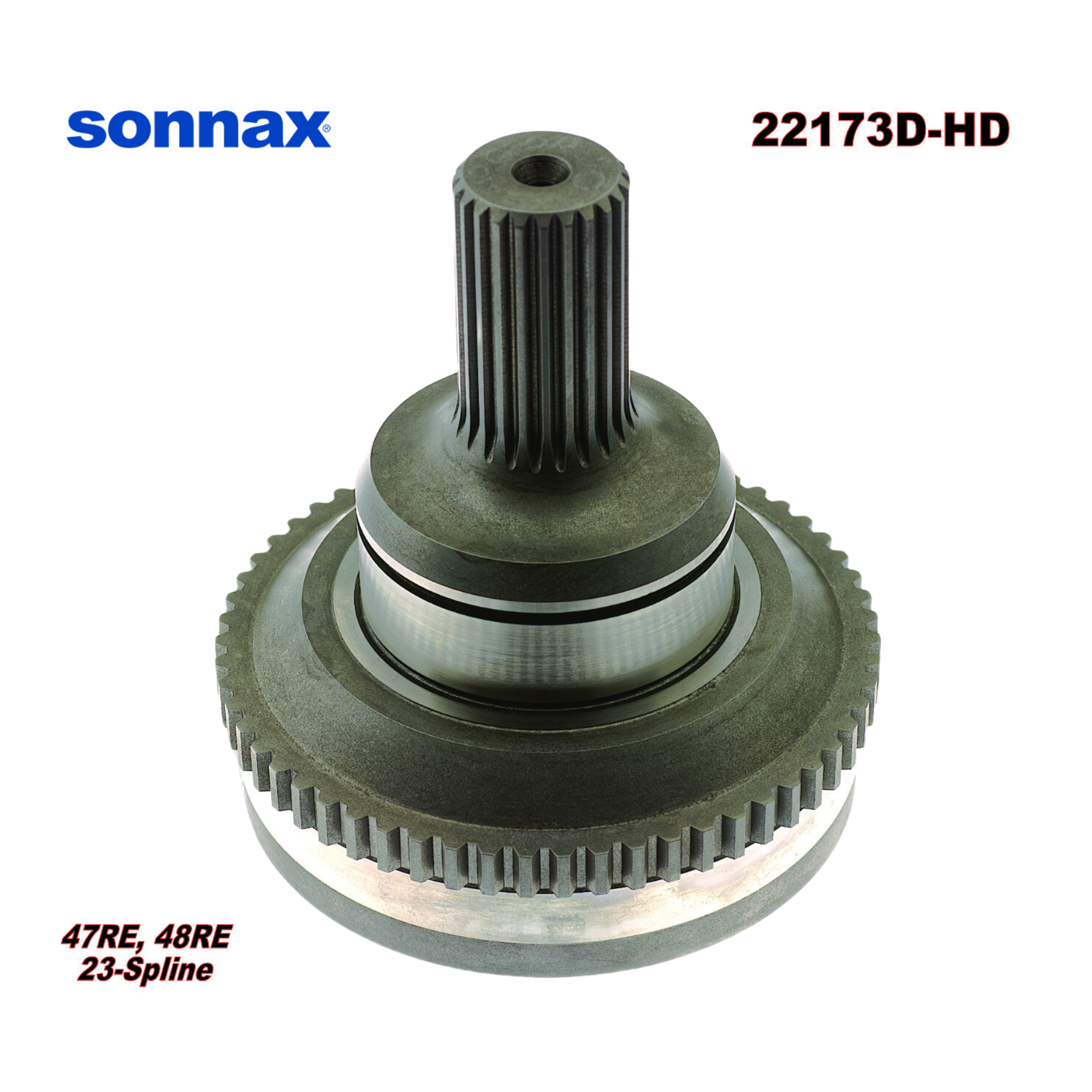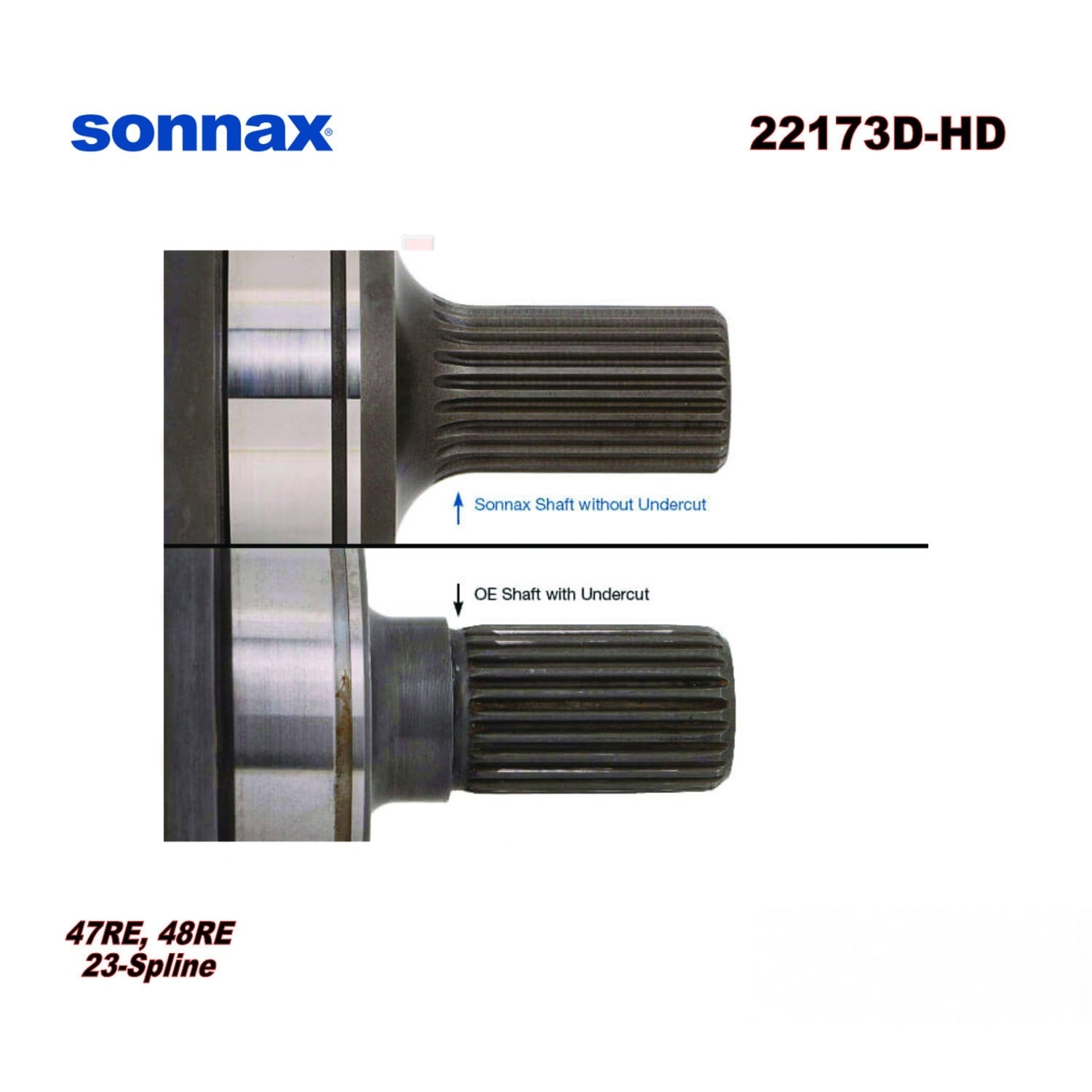 Sonnax heavy duty output shaft 22173D-HD is a direct replacement upgrade for 23-spline OE shafts in Chrysler 48RE and 47RE transmissions. These shafts are prone to breakage at the output spline area, especially in high horsepower/torque vehicles. Delivering a 25% increase in strength compared to OE and significantly stronger than other aftermarket 23-spline shafts, the Sonnax shaft features improved material and an optimized spline design to guard against failure.