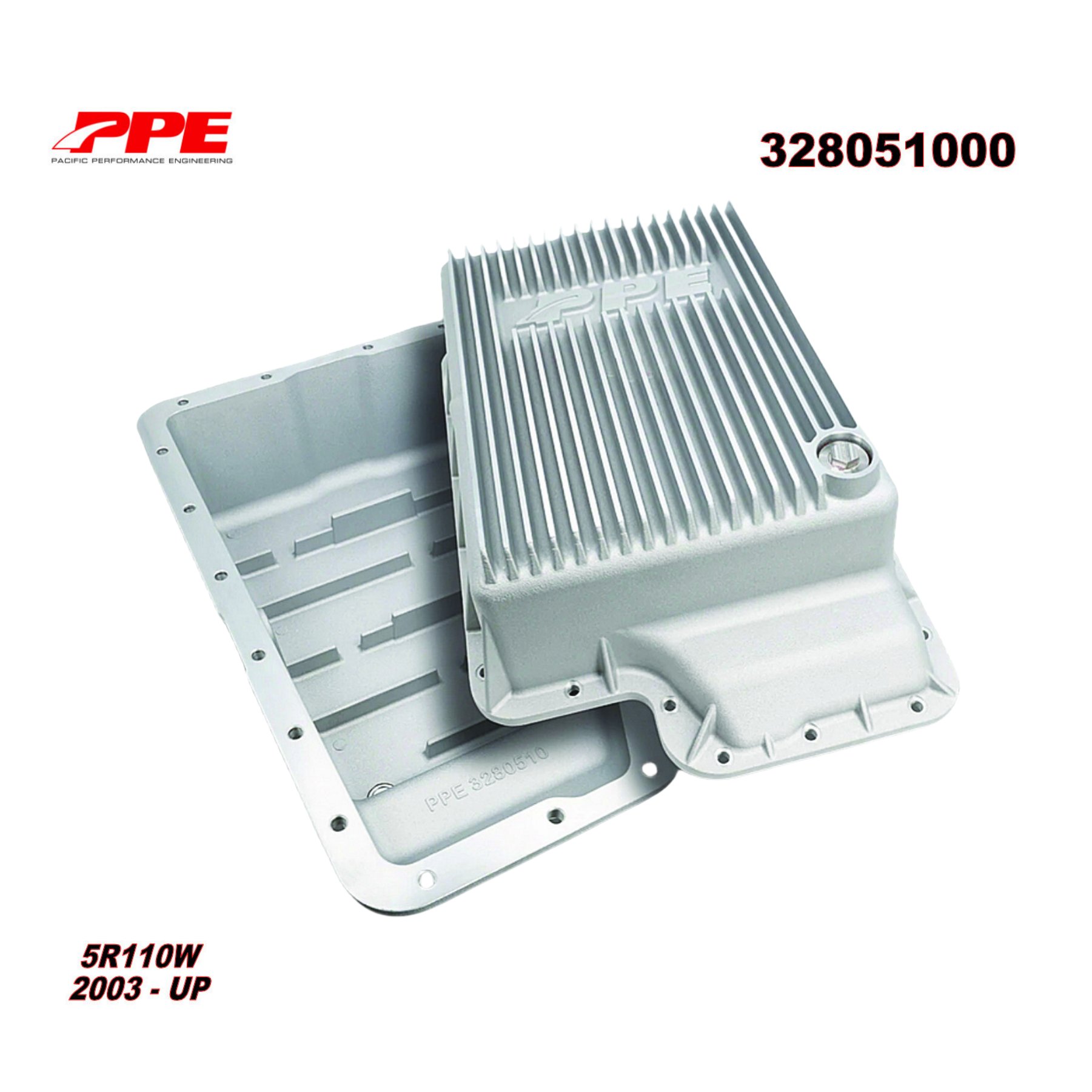 The new PPE Heavy-Duty DEEP Transmission Pan for the Ford 5R110 offers increased transmission fluid capacity, resulting in lower operating temperatures and extended transmission life. Cast from high-strength aluminum for optimal heat dissipation, this pan features internal baffles and external fins to transfer heat and keep your transmission running cool.