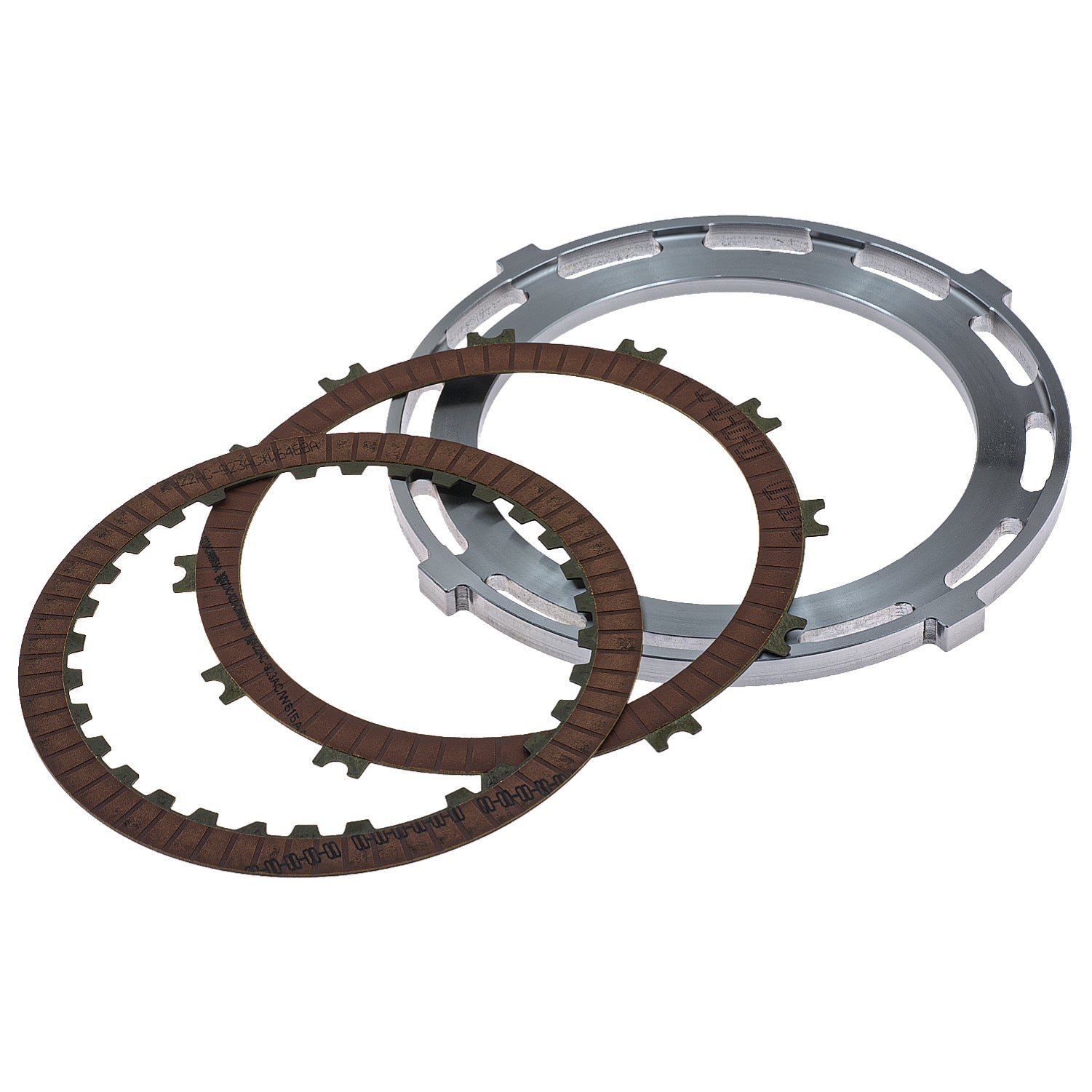 When using this pressure plate, you can add two overdrive frictions for single sided application and one overdrive friction for double sided application. For single sided friction setup like in the 68RFE, the new stack up yields a 15% increase in surface area. Alternatively, for double sided friction setup like in the 545RFE, the end result is a 25% increase in surface area.